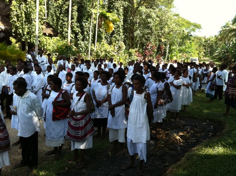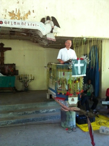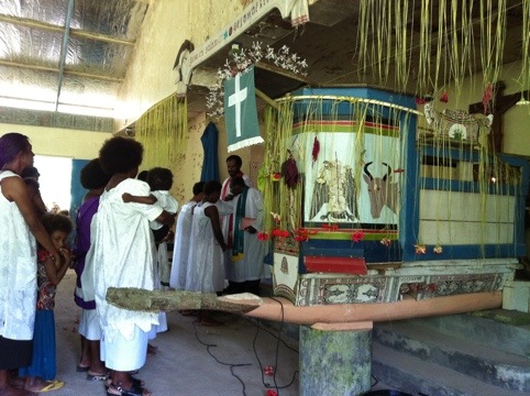 Das Fest der Konfirmation begann am Samstag mit einem Abendgottesdienst für die Konfirmanden und ihre Familien und Gäste. Im Gottesdienst am Sonntag wurden 61 Mädchen und Buben im Alter von etwa 14 Jahren konfirmiert. Die dreistündige sehr abwechslungsreiche festliche Liturgie wurde halb in der Lokalsprache Yabem halb in Tok Pisin gehalten; Predigt natürlich in Pisin, da ich Yabem nicht kann. Toll, auf so einer Kanu-Kanzel predigen zu dürfen (Markus 8,34-36)! Zu den Bildern vom Gottesdienst müsst Ihr Euch eine beeindruckende Phonstärke beim Singen der traditionellen Yabem-Lieder vorstellen.