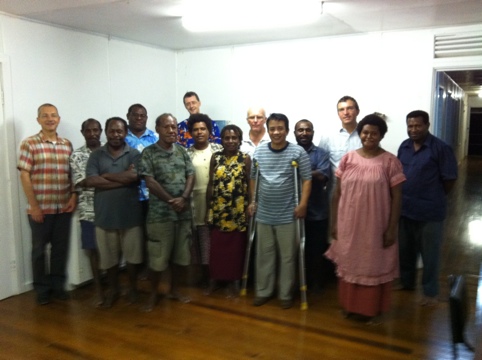 Die Arbeit als Short Term Lecturer am Senior Flierl Seminary in Logaweng ist zu Ende. Mein Nachfolger, dritter von rechts, ist diese Woche bereits mit Familie gekommen – und darf länger bleiben. Hier seht Ihr das für den Lehrbetrieb zuständige Kollegium inklusive studentischer Vertretung bei einem „light refreshment“ zu meinem Abschied.