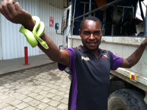 …sind unbeliebt und gefürchtet. PNG beheimatet einige für Menschen tödliche Arten. Leider ist umgekehrt der Mensch tödlich für alle Schlangenarten. Wird man ihrer habaft, werden Schlangen grundsätzlich erschlagen und bereichern den Speiseplan. Eine Schlange als Haustier oder Wegbegleiter? No Way! Deshalb sorgen beide für große Aufmerksamkeit bei gebührendem Abstand.