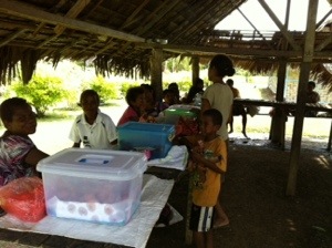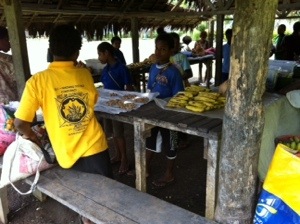 Gleich ist Mittagspause für die Schüler der Ambarina Elementary School (Klasse 3-8). Die Mütter warten schon mit dem Essen: Erdnüsse, Bananen, gekochte Kartoffeln, Taro, Yams, Reis, Gemüse, kleine aus Mehl gebackene Krapfen etc.