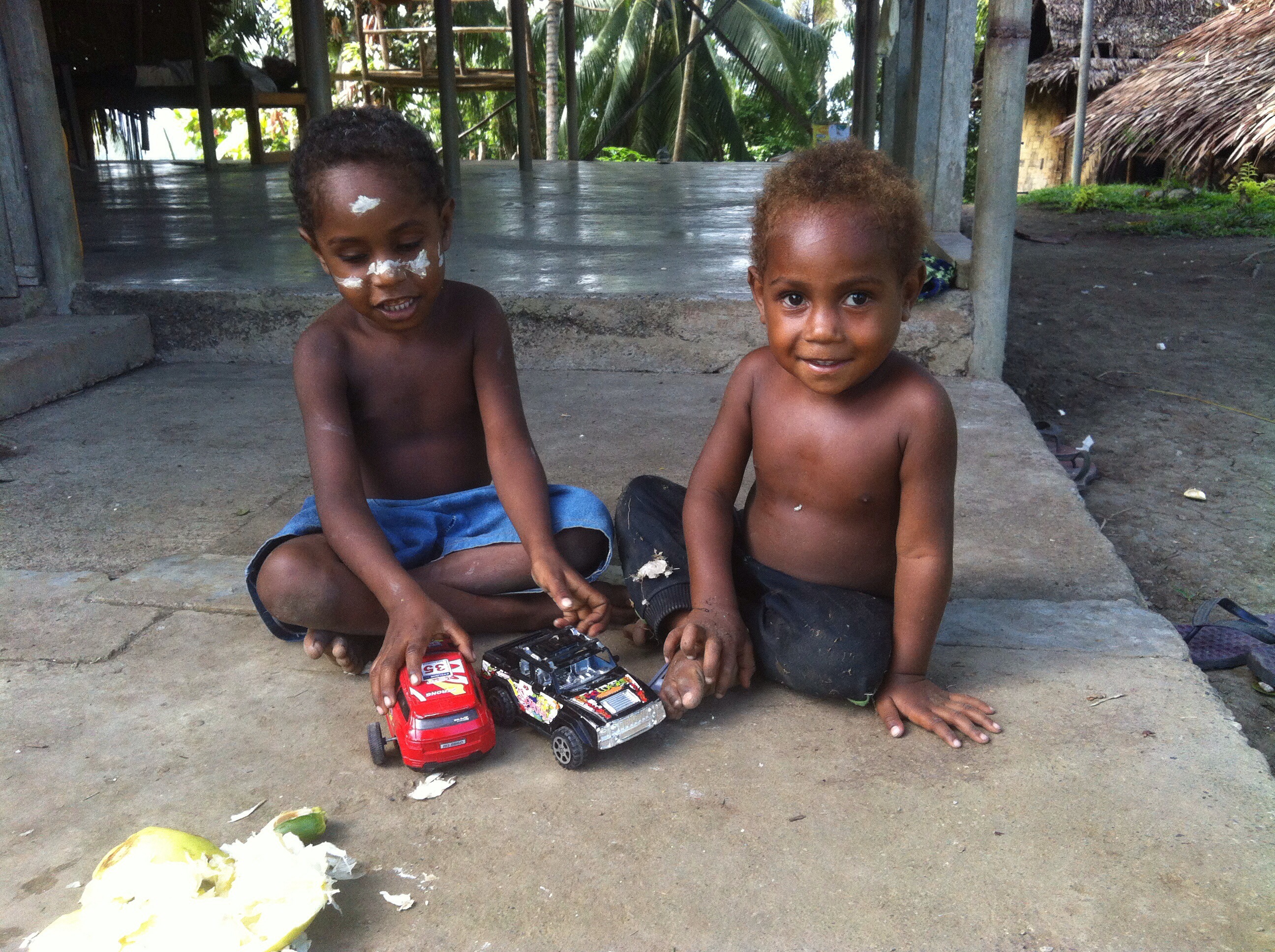 Auf Anordnung der Mama haben die beiden die Pomelo vorne links ganz schnell verspeist, um sich wieder ihren Fahrzeugen widmen zu dürfen.