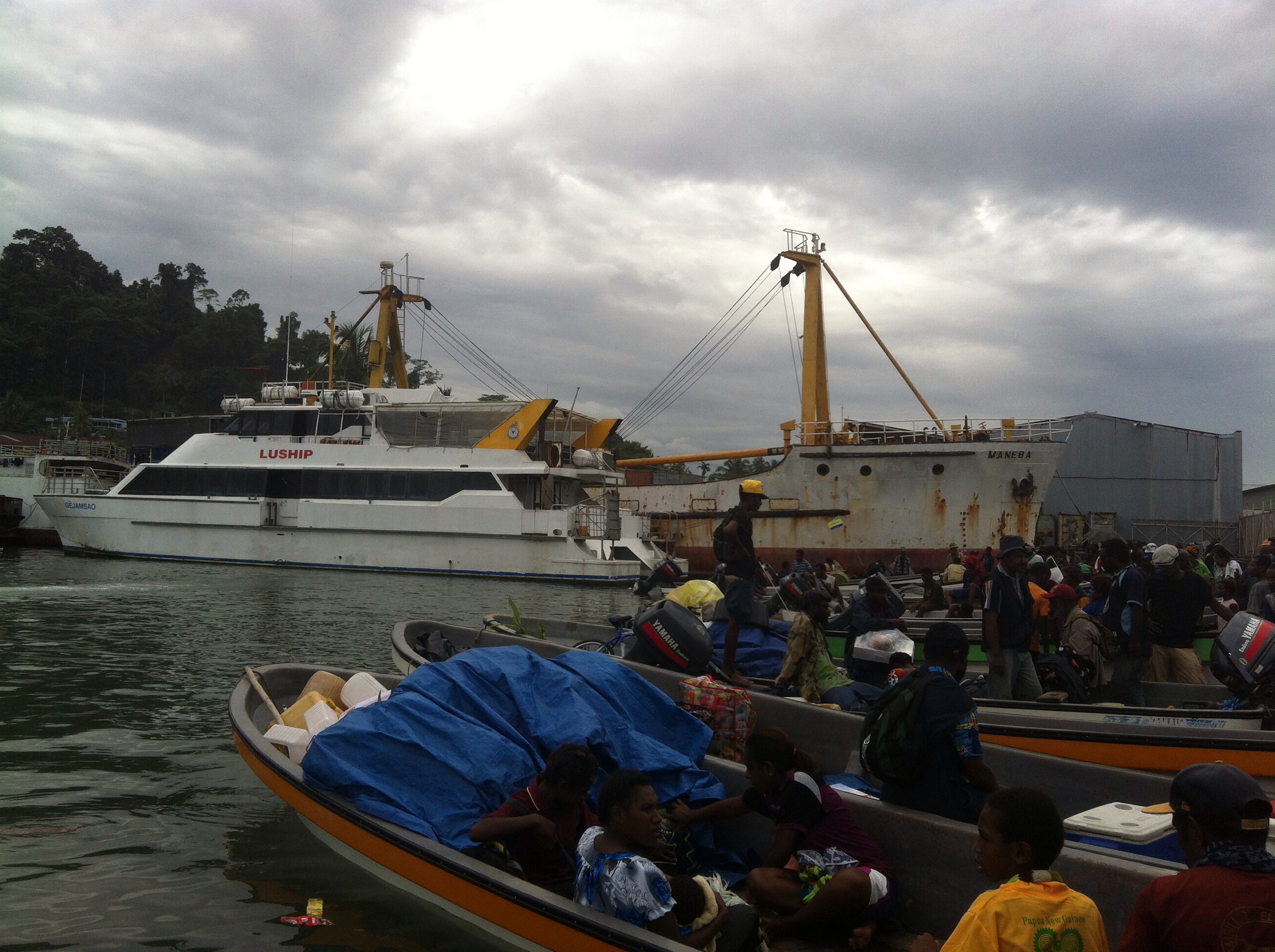 um von Lae nach Finschhafen zu kommen. Bis vor kurzem bediente Luship (Lutheran Shipping) die Küstenorte. Im Hintergrund seht Ihr das Schiff. Die Kirche wickelt ihre Firma gerade ab und stellt nach 80 Jahren den Service ein. Jetzt gibt’s nur noch Speedboats.