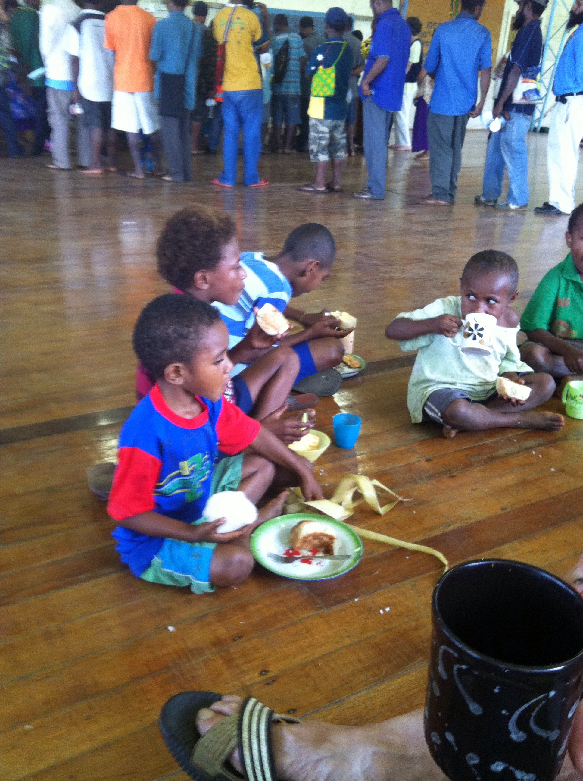 für zwei Weltwärtsfreiwillige. Bereits während der Reden und Darbietungen – Sketche, Tänze, Lieder – freuen sich alle aufs Buffet. Die Vorbereitung dazu klappt problemlos. Nach dem Gottesdienst kommt eine kurze Ansage: „Alle gehen jetzt nach Hause, kochen dort bitte eine Kleinigkeit und kommen dann damit in die Aula.“ Teller, Becher und Besteck bringt man sich bei solchen Veranstaltungen grundsätzlich selber mit. Was gibt’s zu essen? Süßkartoffeln, Kochbananen, Taro, Yams, Reis, Gemüse. Alles lecker zubereitet, z.B. in Kokosnuss-Suppe gekocht oder mit den beliebten Maggi 2-Minute Noodles gemischt.