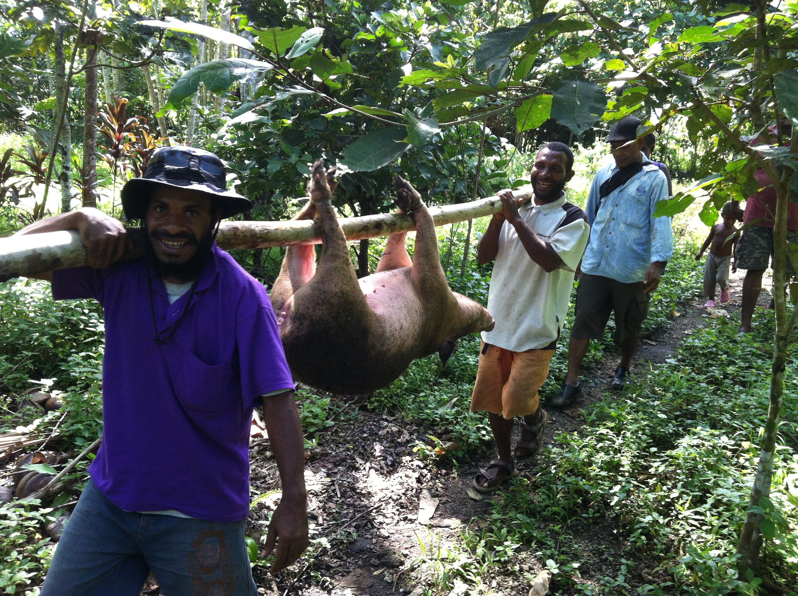 hat die arme Sau eher nicht. Sie hat gerade für umgerechnet 170 € die Besitzer gewechselt und wird heute nach der Konfirmation verspeist. Schweine müssen hier für alles Mögliche herhalten: Sie sind Statussymbol, werden als Brautpreis eingesetzt oder bei Versöhnungsfeiern ausgetauscht. In der religiösen Symbolik kommt ihnen die Rolle des „Opferlammes“ zu. Schwein zu haben, eins zu bekommen oder zu essen, bedeutet für einen Neuguineer einfach pure Freude.