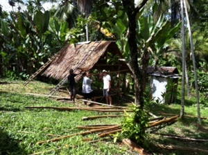 Schreinermeister Unun und die Schüler aus Ukarumpa haben das Hühnerhaus fast fertig gebaut. Sonntag gibt’s die Einweihung. Rechts hinten übrigens ein „pos opis \ post office“ (Klo).
