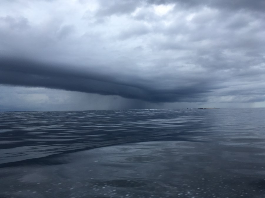 Die Regenwand verspricht ein spiegelglattes Meer – solange wir vor ihr her fahren. Sie bewegt sich von Ost nach West. Das ist unsere Richtung, von Finschhafen nach Lae. Ohne nass oder, wie üblich, durchgeschüttelt zu werden, erreichen wir in unter drei Stunden die 90 km entfernte Stadt. Auf der Dinghy-Genuss-Skala: 10 von 10 Punkten.